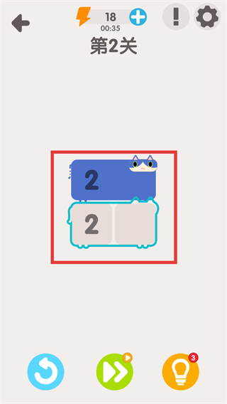 2、在【第2关】中,观察标有【2】的方块区域,滑动屏幕将两个格子进行连接。