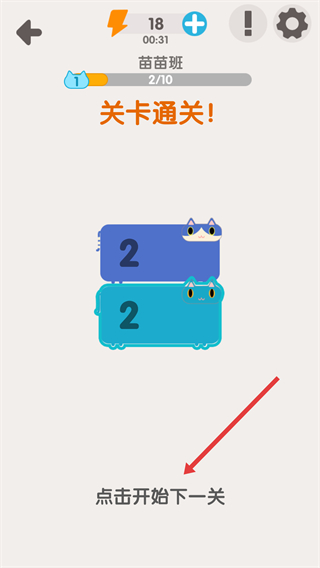 4、关卡通关后出现【关卡通关!】提示,点击【点击开始下一关】按钮,进入后续数方解谜关卡。