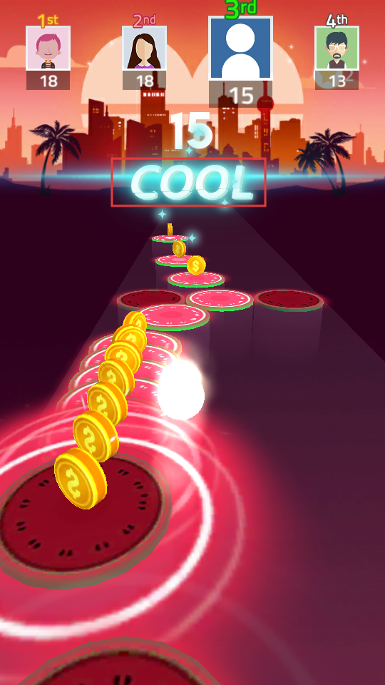 2、操控小球在西瓜踏板移动,收集金币,获取【COOL】评价以提升排名。