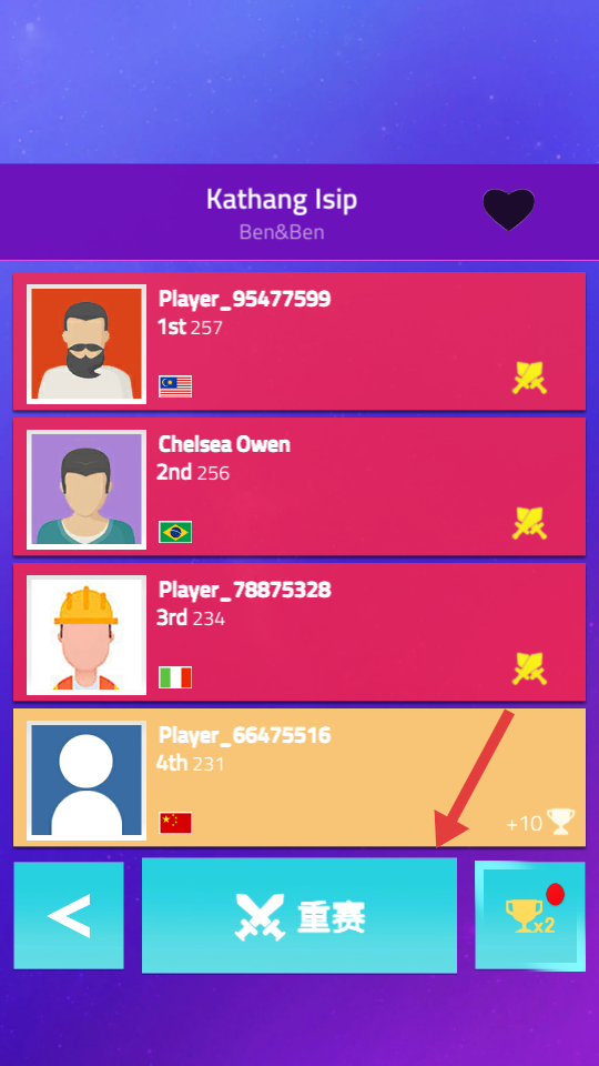 4、结算后点击【重赛】,再次挑战歌曲【Kathang-Isip】,争取更高排名与得分。
