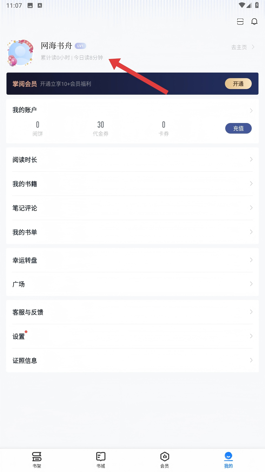 1、在掌阅软件,进入【我的】界面,点击用户名区域,进入个人主页呢。