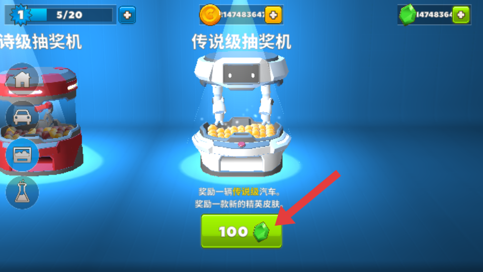 2、在抽奖界面,花费100绿宝石参与传说级抽奖机抽奖,有机会获得传说级汽车和精英皮肤。