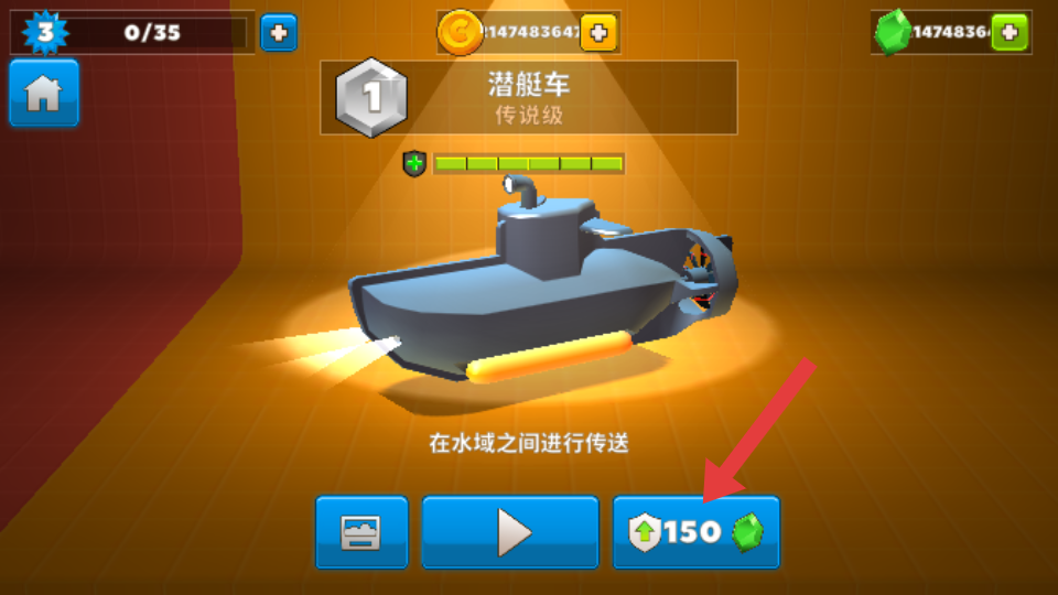 3、获得传说级潜艇车后,可花费150绿宝石提升其属性,增强在水域传送等方面的能力。