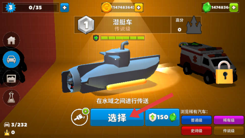4、对传说级潜艇车属性提升后,点击【选择】按钮,将其选为参赛车辆,开启优势竞技。