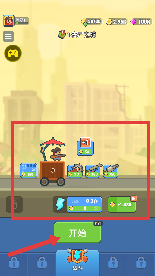 1、升级战车的武器和属性,提升战力后点击【开始】,进入【丧尸之城】战斗场景。
