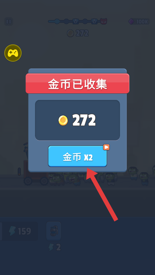 4、战斗结束后,直接点击【金币X2】观看广告,利用免广告获取双倍金币。