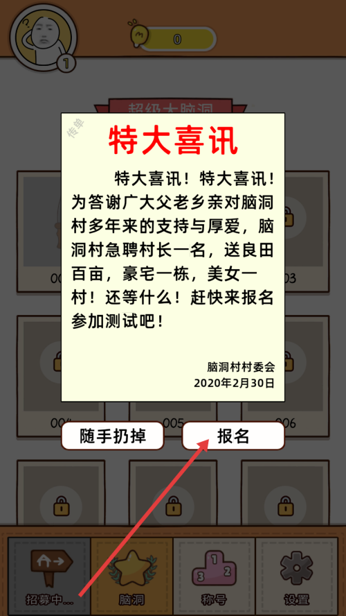 1、看到【特大喜讯】弹窗,若想参与村长招聘,点击【报名】按钮,即可参加测试,开启后续游戏流程。