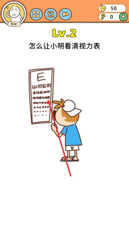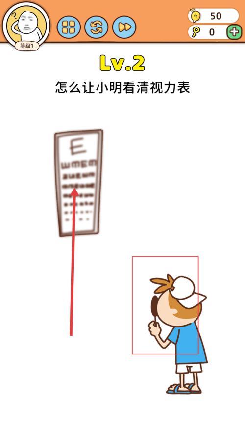 2、到Lv.2关卡,面对【怎么让小明看清视力表】的问题,观察场景元素,思考让小明靠近视力表的操作。