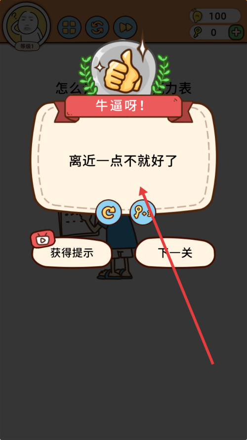 4、成功通关后,会看到【牛逼呀!-离近一点不就好了】的提示,此时可点击【下一关】,继续挑战新关卡。