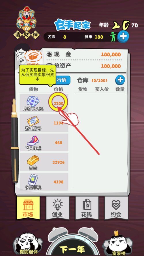 2、在市场界面,按照“低买高卖积累资本”的提示,可先关注【航拍无人机-3200】等货物,寻找买卖时机。