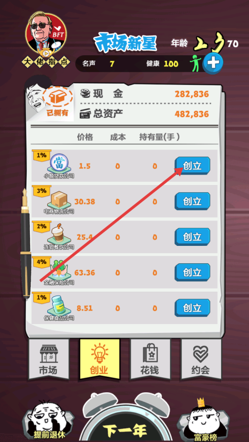 3、积累一定资本后,进入创业界面,可点击【小额贷款公司-创立】等按钮,创立公司,拓展赚钱渠道。