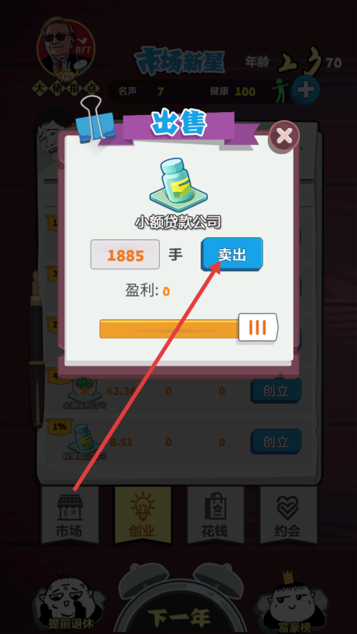 4、创立公司后,若想调整资产,在出售界面,可点击【小额贷款公司-卖出】按钮,处置所持有的公司份额。