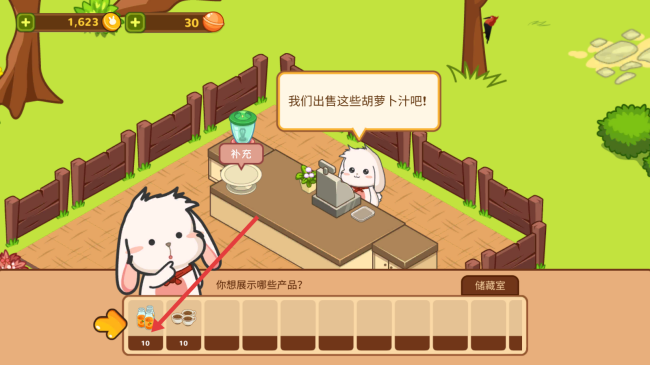 4、出售胡萝卜汁时,选择要展示的产品,将制作好的胡萝卜汁进行售卖,获取收益。