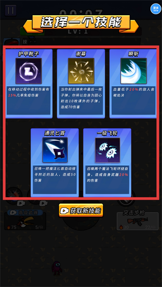 4、进度满后进入技能选择界面,可挑选【护甲靴子】或【谢幕】等技能,匹配战斗方式,强化生存或输出的能力。