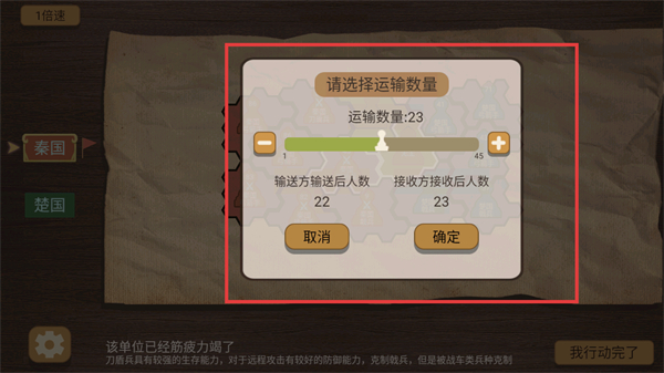 3、在运输界面选择【23】兵力输送,平衡【输送方】与【接收方】人数,增强前线接收方战力以应对敌方。