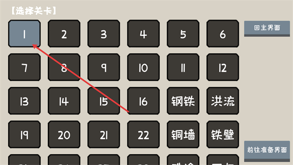 2、关卡选择界面中,先选择第1关开启游戏,后续关卡需依次解锁,不同关卡对应不同的战场难度与敌方配置。