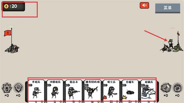 3、战斗准备阶段,初始拥有20金币,可选择兵种部署,右侧为敌方据点,需推进战线争夺旗帜。