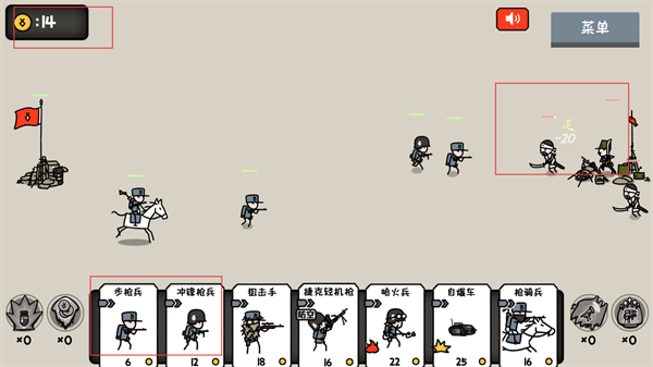 4、战斗中部署枪骑兵等兵种(消耗金币,剩余14),兵种会自动向敌方据点移动交战,击败敌方单位可获取金币。