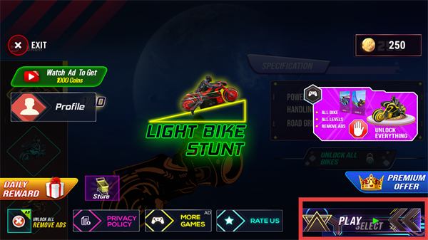 1、点击【PLAY-SELECT】,进入《超级坡道摩托车》游戏,开启摩托特技挑战。