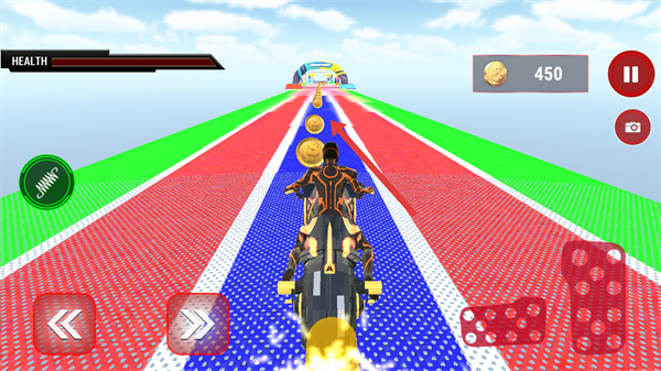 4、遇到坡道,点击【JUMP】按钮让摩托腾空,在赛道收集金币,完成特技动作。