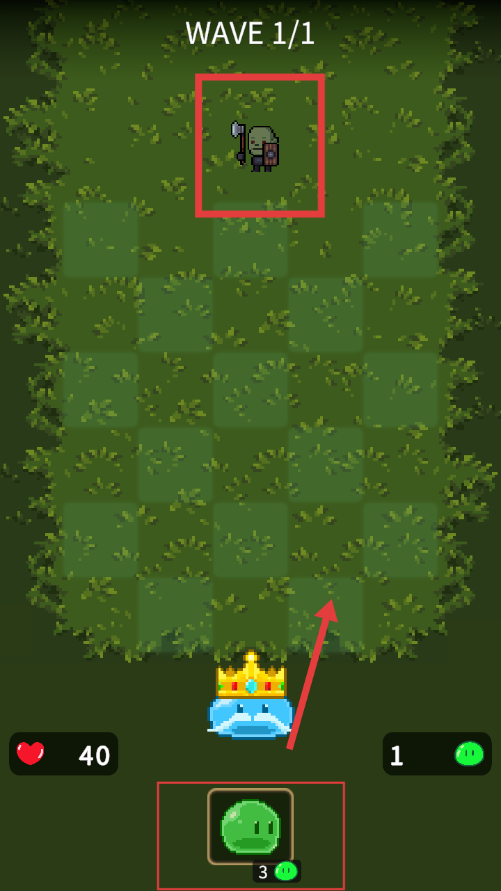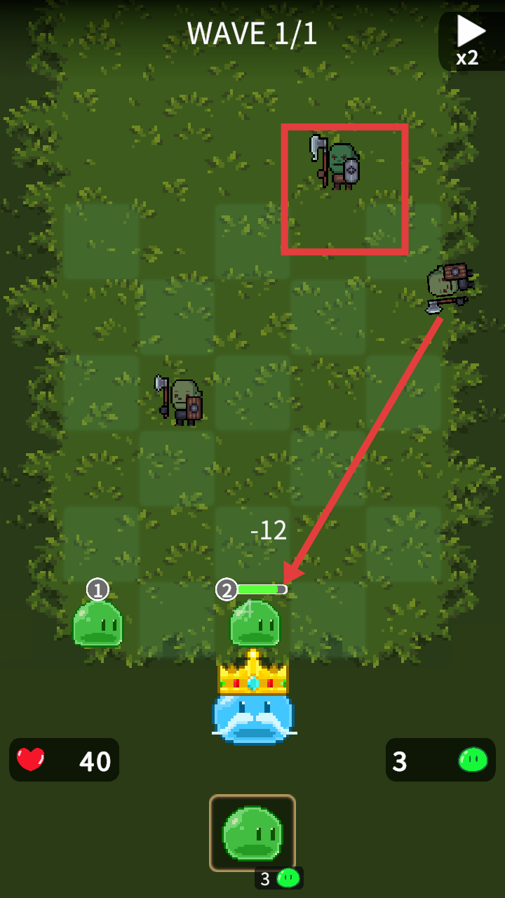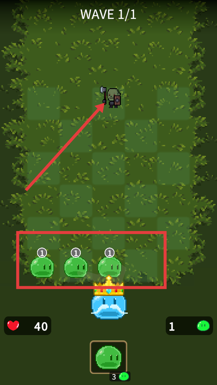 3、继续战斗,放置更多绿色史莱姆,形成防线,应对上方逼近的敌人,利用史莱姆的数量优势抵御进攻。