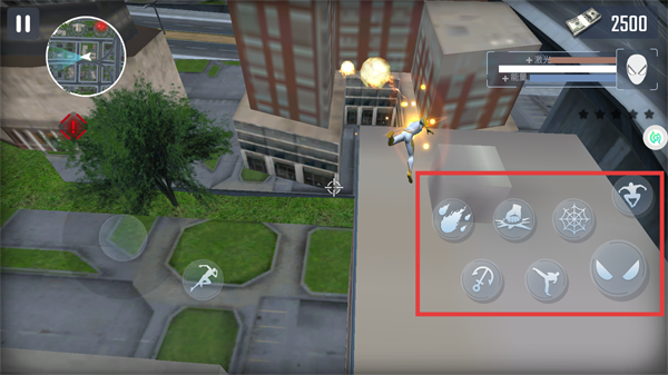 4、遇敌人或互动点,点击右侧技能图标(如火焰、拳头、蛛网等),释放技能完成任务。