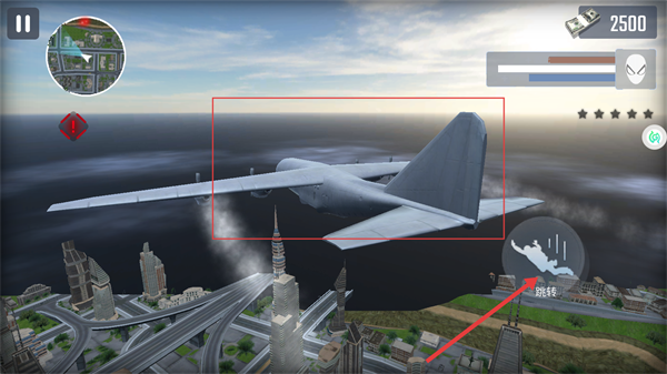 2、正在飞机上时,点击【跳转】按钮,从飞机跳下,进入城市区域。