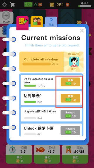 3、完成任务领取奖励,提升等级,获取资源,助力餐厅发展。