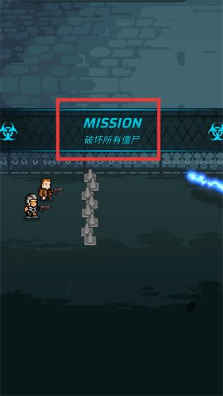 1、战斗界面显示【MISSION-破坏所有僵尸】的目标,操控角色与辅助单位协同攻击,推进任务进度。