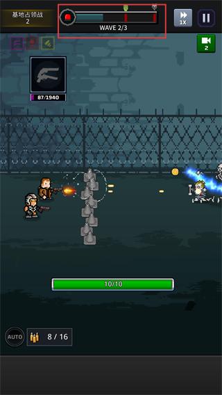 2、进入【基地占领战-2】的【WAVE-2/3】战斗,弹药剩余8/16,持续攻击敌人以削减敌方血量条。