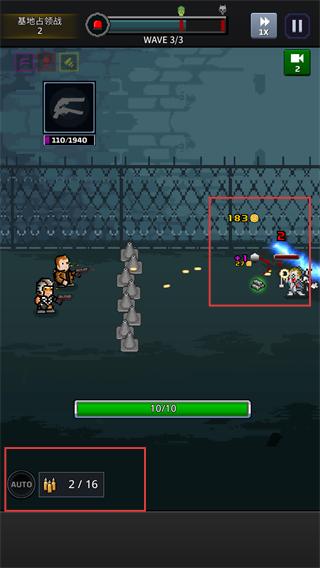 3、战斗进入【WAVE-3/3】,弹药剩余2/16,消灭敌人后拾取掉落的183金币等资源,完成关卡进度10/10。