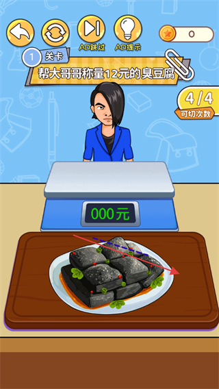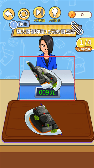 2、在关卡中,通过切割臭豆腐,将其分成不同重量的部分,逐步尝试将臭豆腐放置在秤上,使秤的金额接近12元。