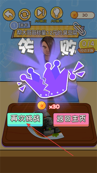 4、若挑战失败,可点击【再次挑战】,重新尝试切割和称重策略,直至成功完成12元臭豆腐的称量任务。