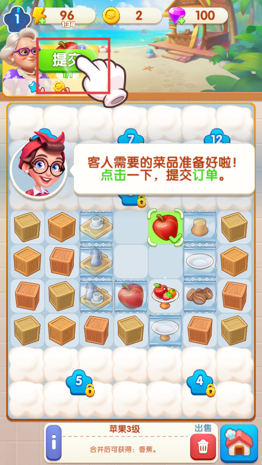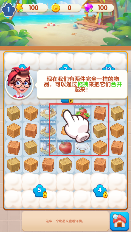 2、按照提示,拖拽两件完全一样的物品,将它们合并起来。