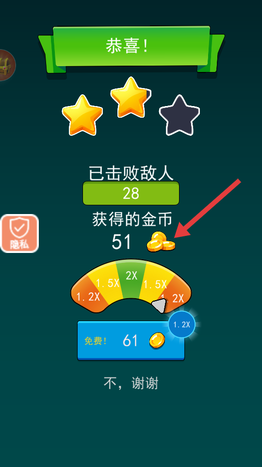 4、成功击败敌人后,会显示“恭喜!”,可查看击败敌人数量和获得金币数,还能选择倍数获取更多金币。