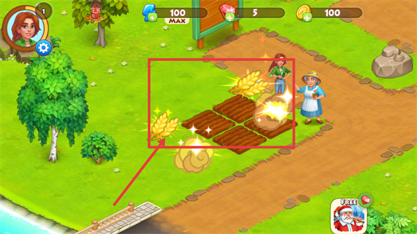 2、收割后田地出现【麦穗】和金币,资源获取成功,可准备种植。