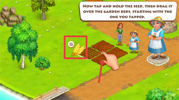 3、按住【种子】,拖动到开垦的田地,从点击的田开始完成播种。