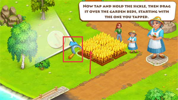 1、按住【镰刀】,拖动它覆盖麦田,按提示从点击的田开始收割。