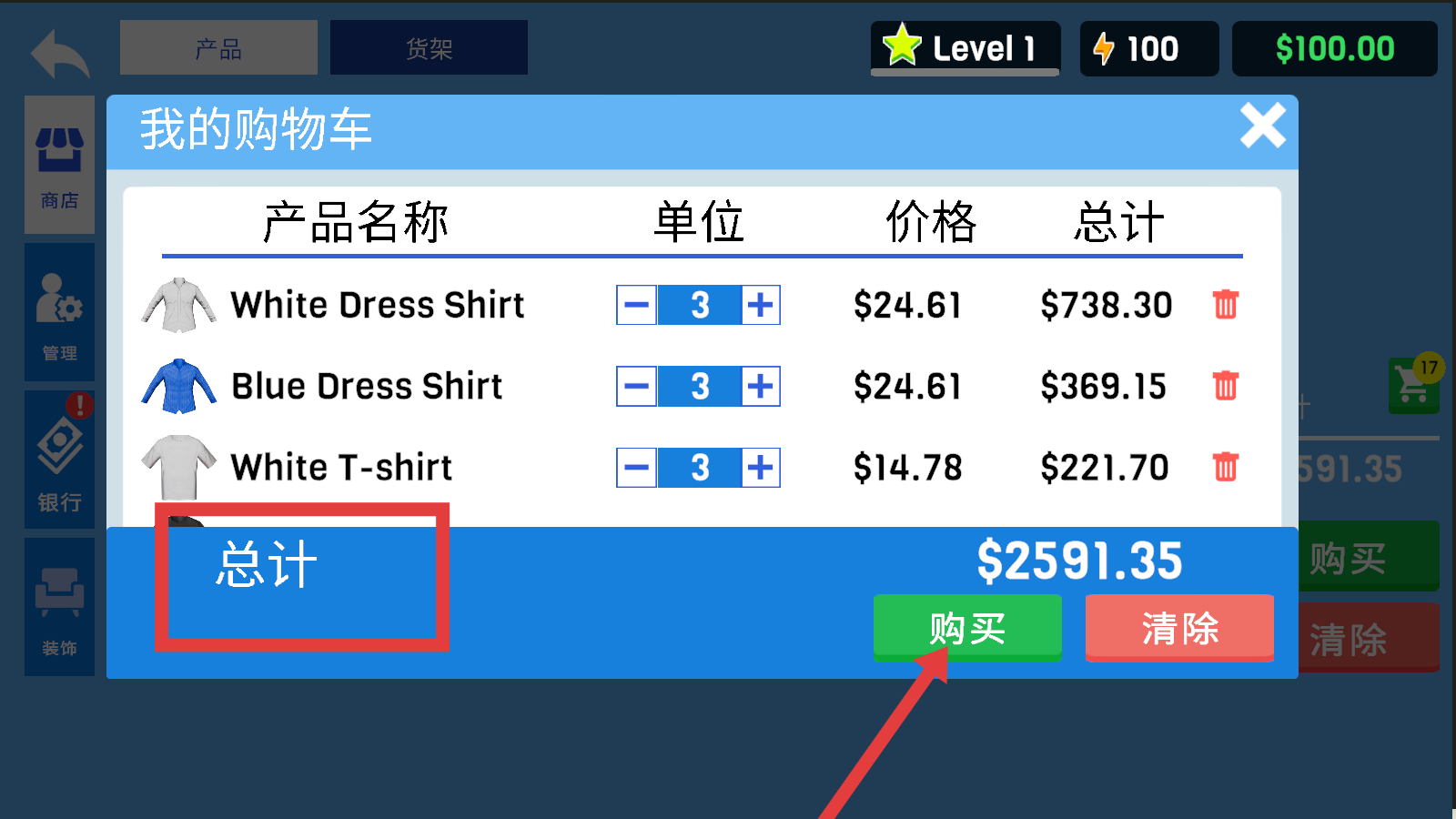 4、查看购物车【总计】金额,确认后点击【购买】按钮,完成商品采购流程。