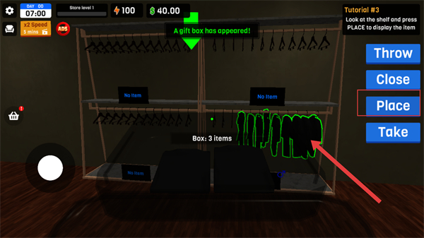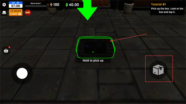 1、长按拾取地面箱子,按指引操作,开启服装经营流程。