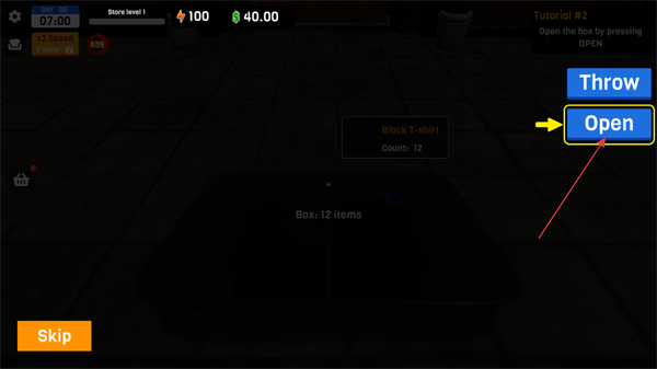2、点击【Open】按钮,打开装有黑色T恤的箱子,获取待售商品。