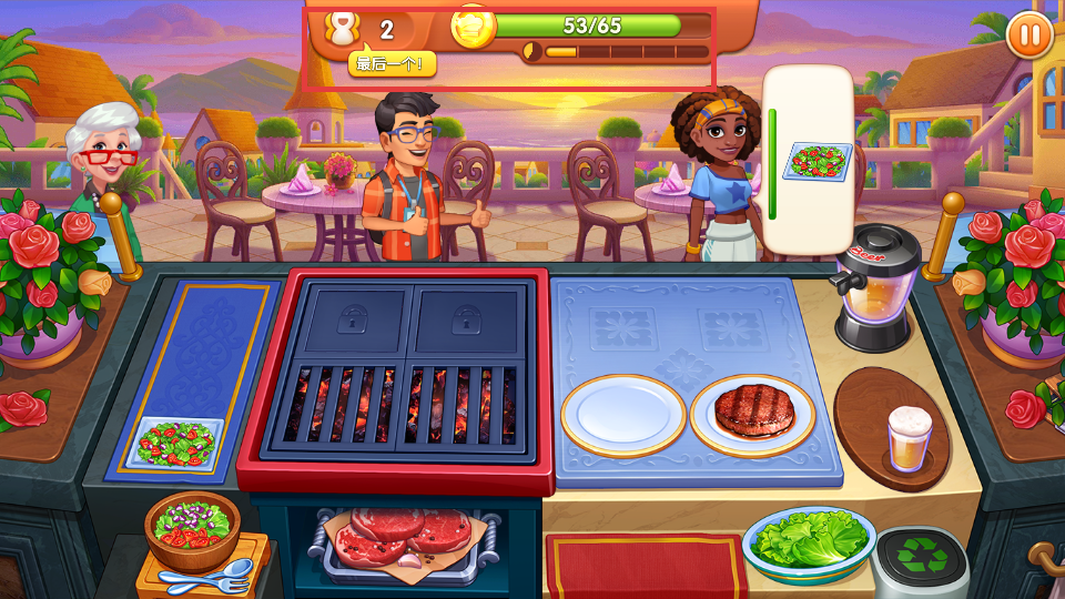 3、查看顾客的点餐需求,快速制作并交付美食,关注关卡进度。