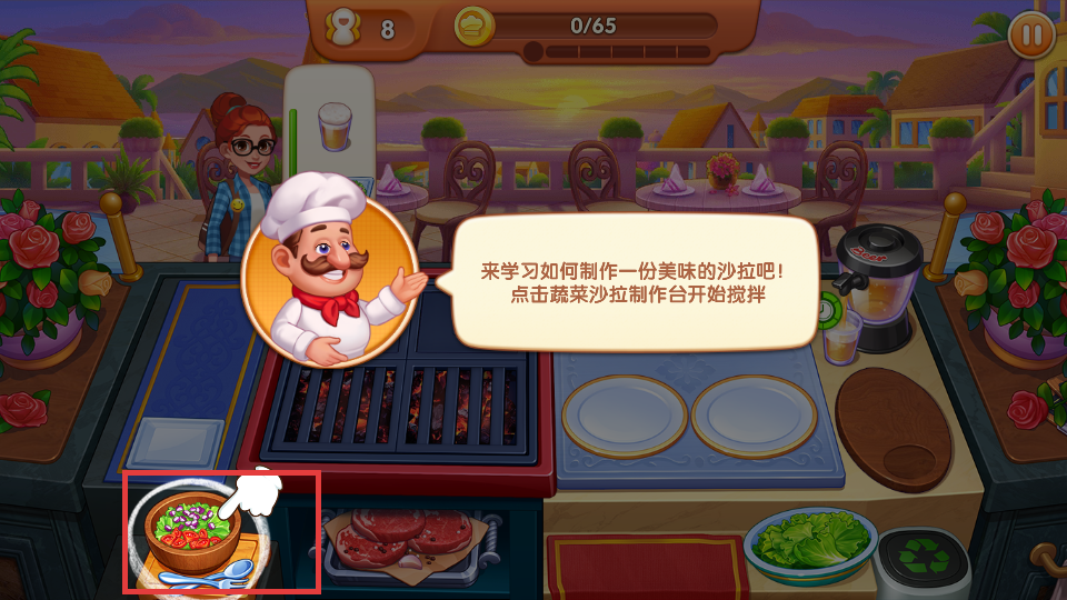 1、根据指引,点击蔬菜沙拉制作台开始搅拌制作沙拉。
