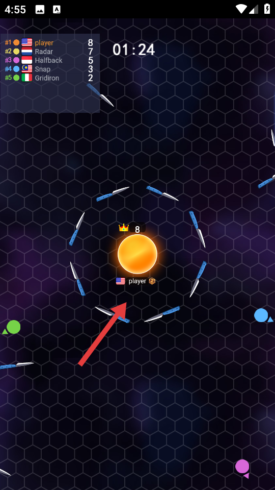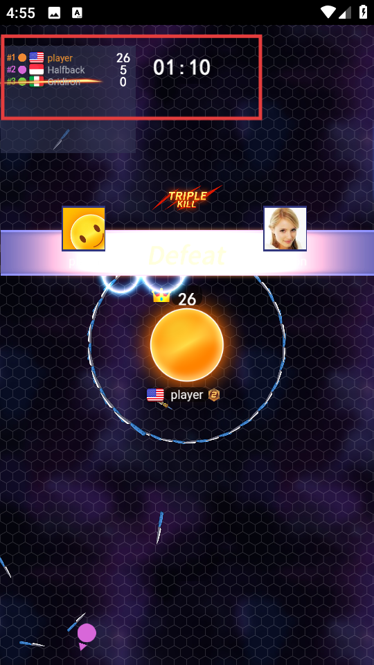 2、操控角色让飞镖环绕自身,形成防御,同时攻击其他玩家,提升分数。