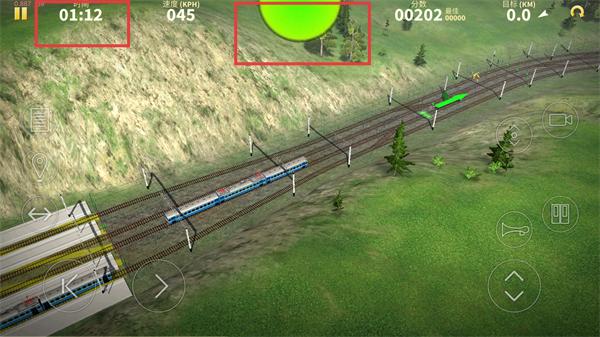 1、观察界面左上角的时间与速度显示,操作左侧操控键,控制火车沿轨道向绿色箭头指引方向行驶。