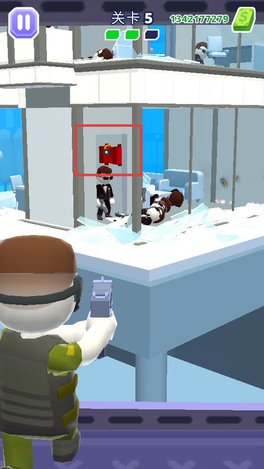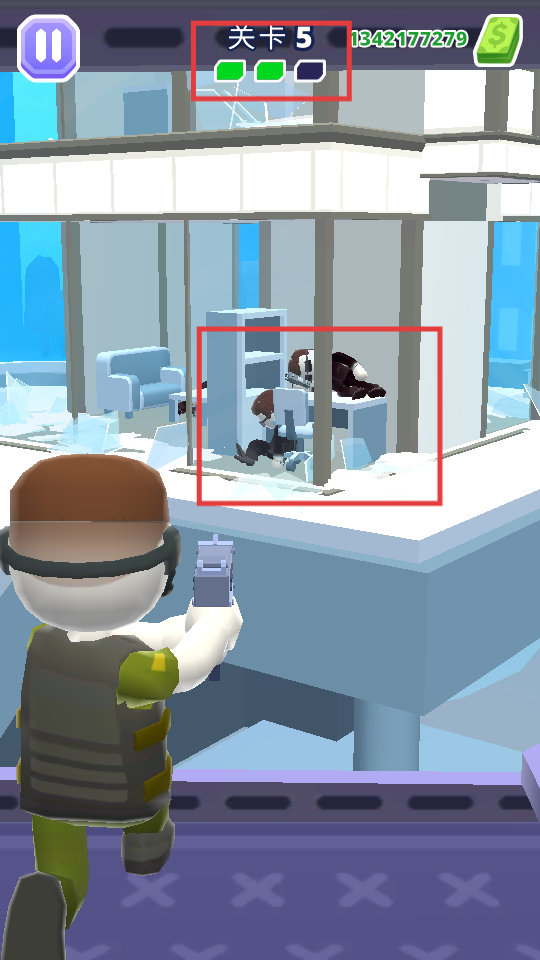 2、进入关卡,瞄准建筑内的敌人,进行射击,推进关卡进程。