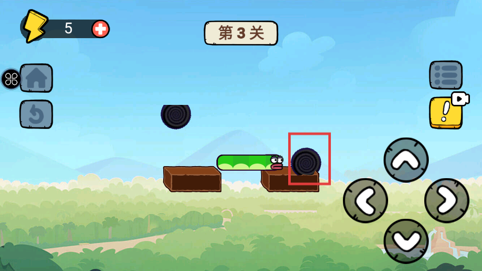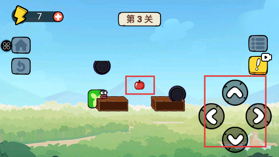 2、在关卡中,使用右侧方向按钮,操控蛇向右移动,获取中间的苹果。