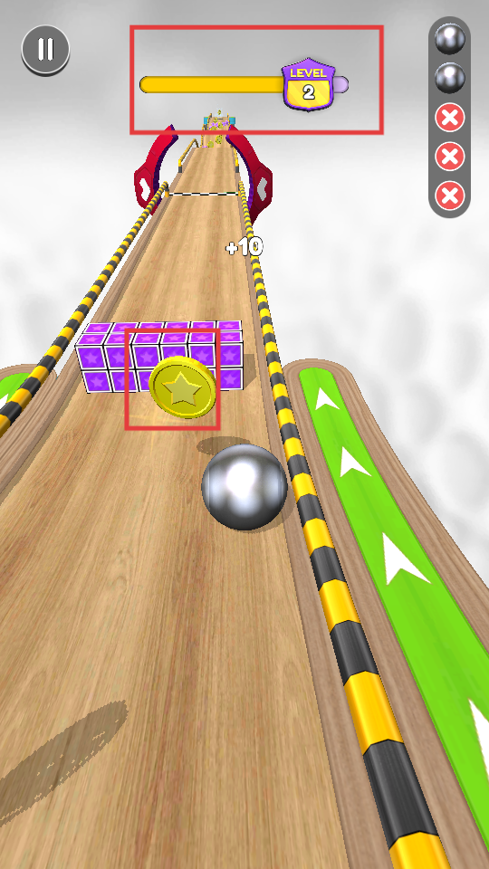 3、操控金属球收集赛道上的金币,同时关注上方的关卡进度条,推进关卡。