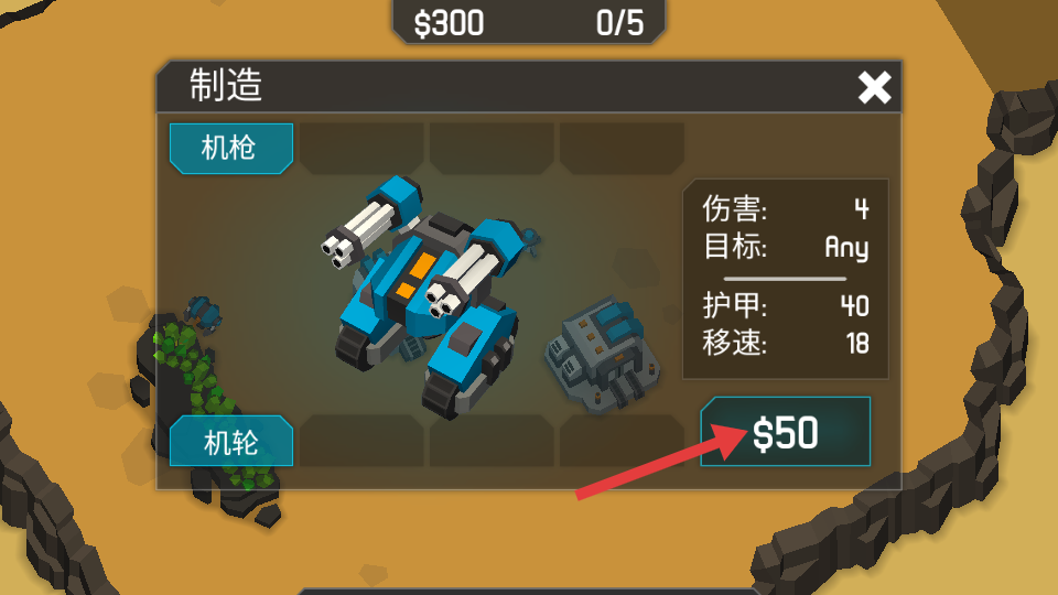3、在制造界面,花费【$50】制造机枪单位,获取具备伤害、护甲等属性的战力。