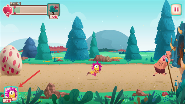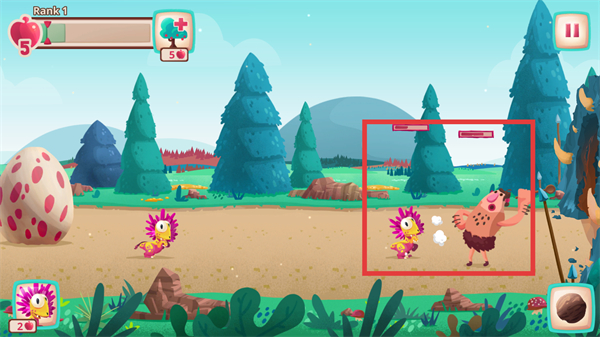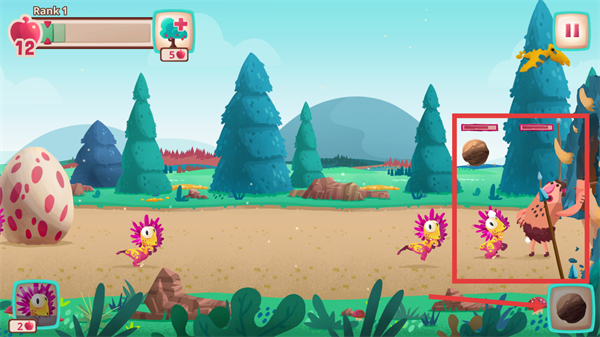 3、操控召唤的恐龙靠近红框内的原始人,发起攻击削减其血量,击败敌人后提升【Rank.1】对应的分数。